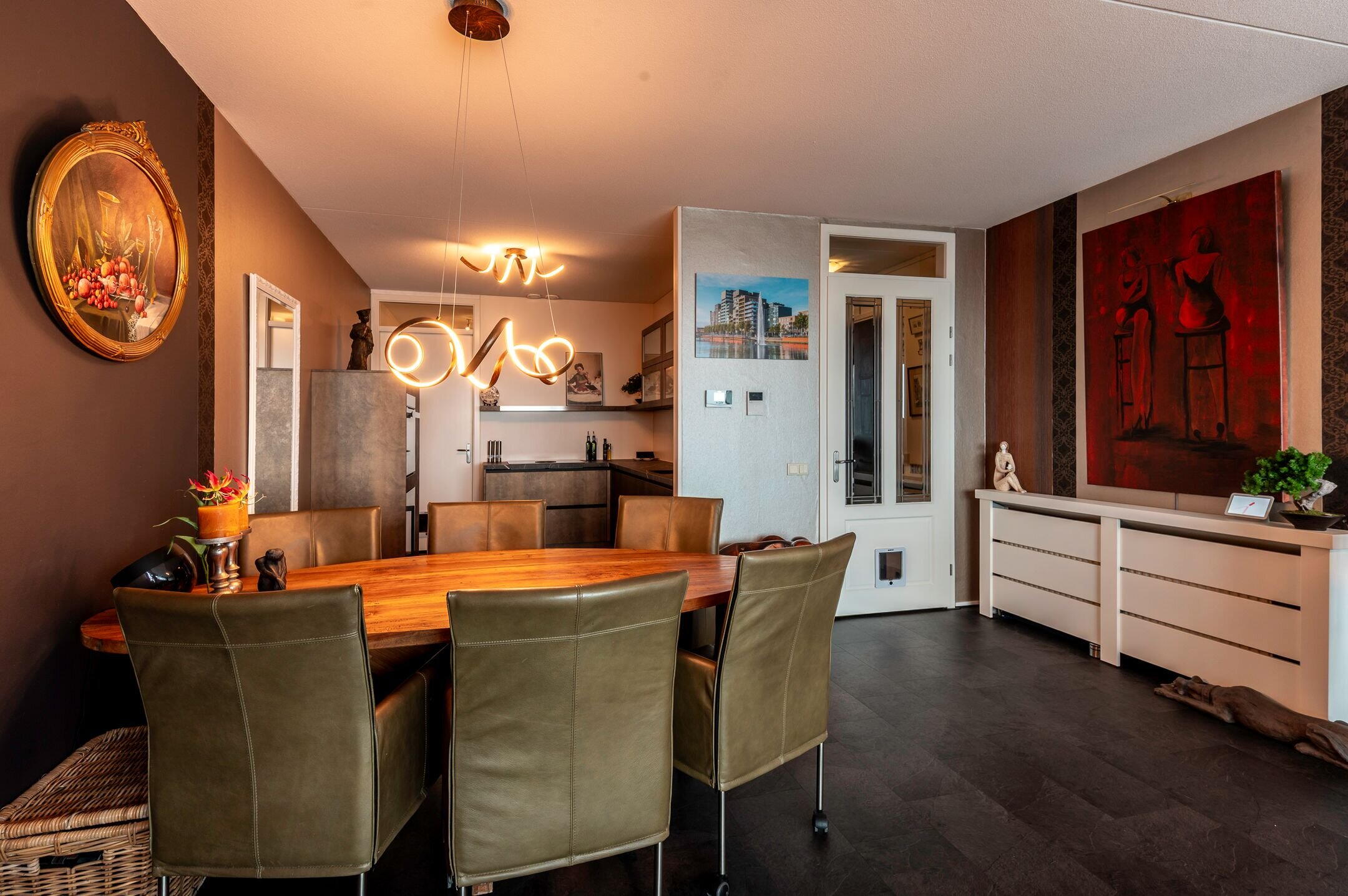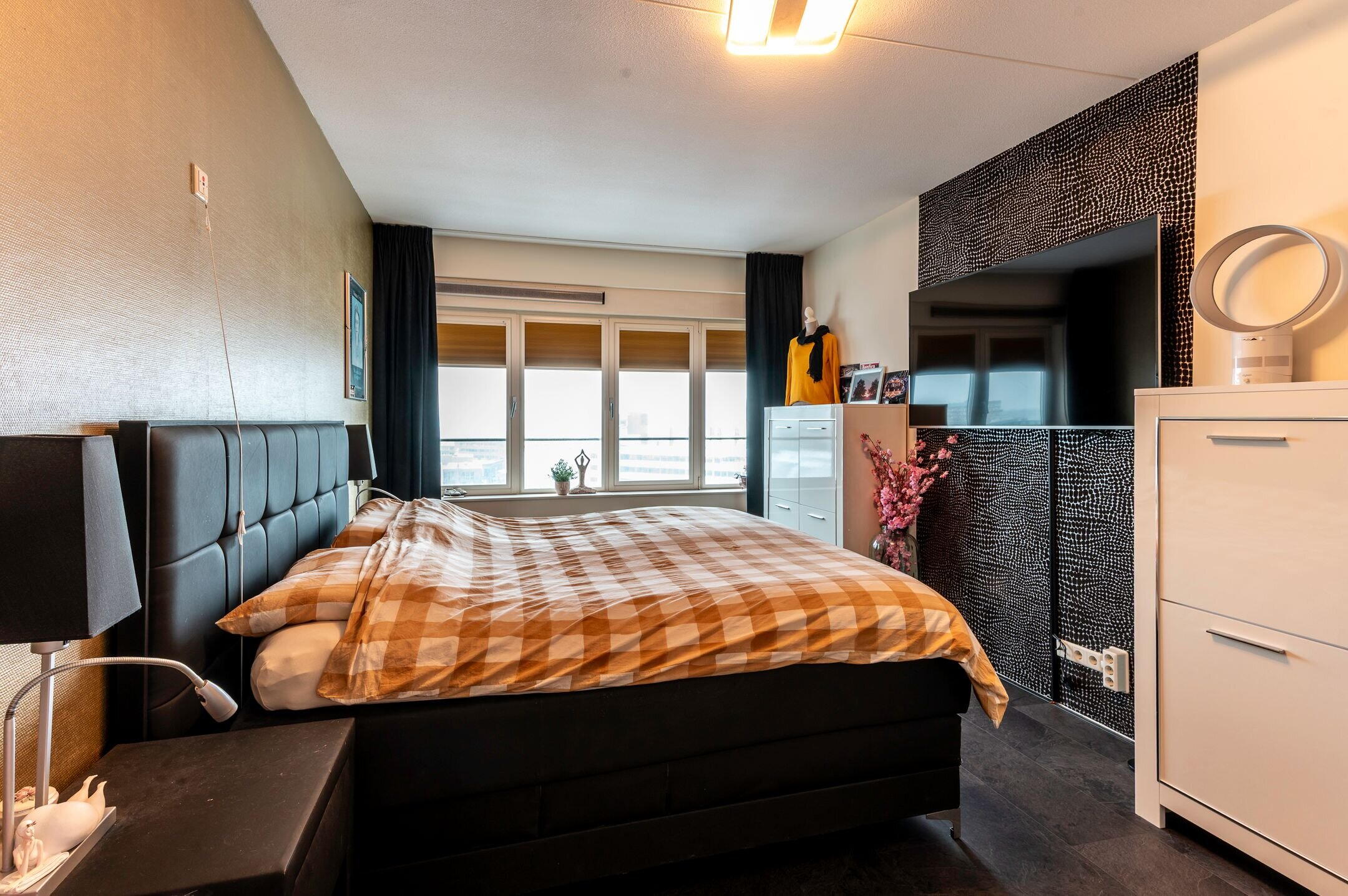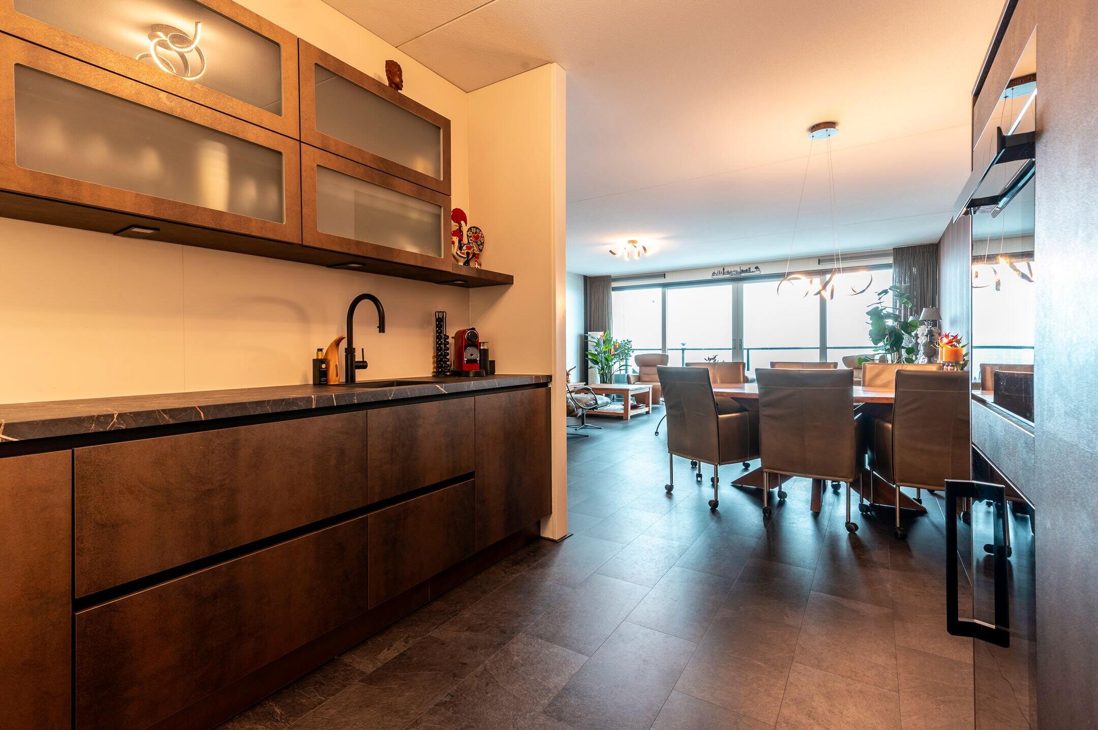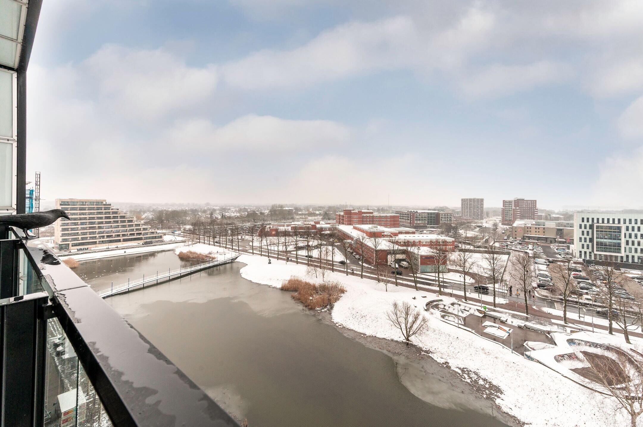 Achtste verdieping (appartement): Entree; hal met meterkast, toilet en toegang tot de woonkamer, twee slaapkamers en de badkamer; woonkamer van 44m² met twee schuifdeuren welke toegang bieden tot het een het balkon op het zuiden van 6 meter breed met uitzicht op een waterpartij; keuken uit 2024 in hoekopstelling en voorzien van onder meer een Quooker, oven, (wijn)klimaatkast, een Bora inductiekookplaat met interne afzuiging, vaatwasser en toegang tot de bijkeuken; bijkeuken met witgoedaansluitingen, de CV-opstelling en de mv-box (beide in 2021 vervangen) ; twee slaapkamers van respectievelijk 13,1- en 20,3m²; badkamer welke in 2021 is vervangen en is voorzien van volledige betegeling, een zgn. Japans toilet (toilet met bidetfunctie), een wastafelmeubel met 2 wastafels en 2 spiegels en een ruime inloopdouche met regendouche en een sunshower.