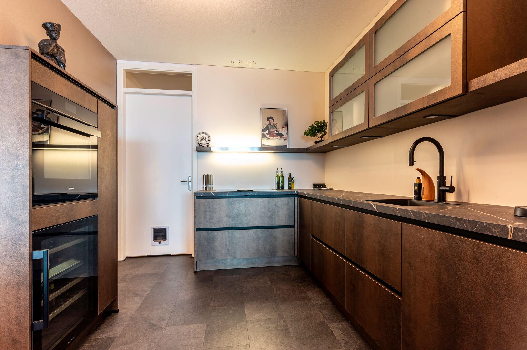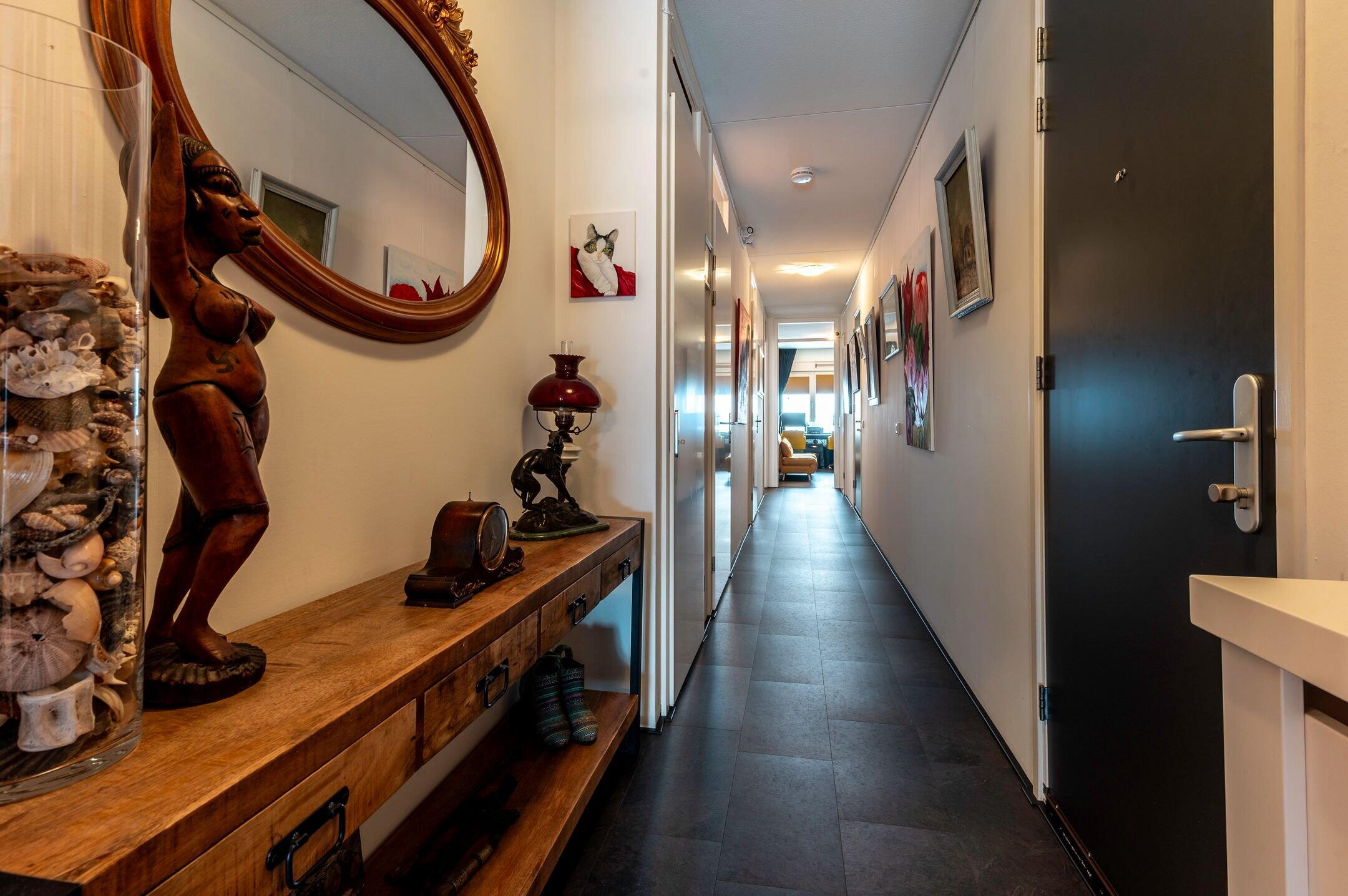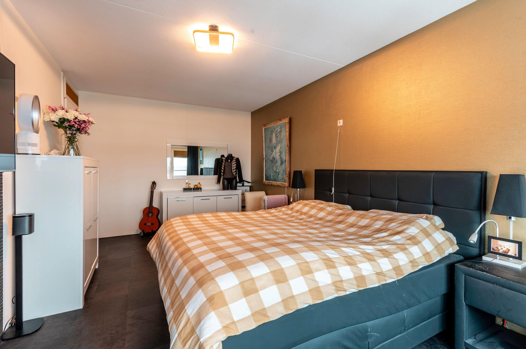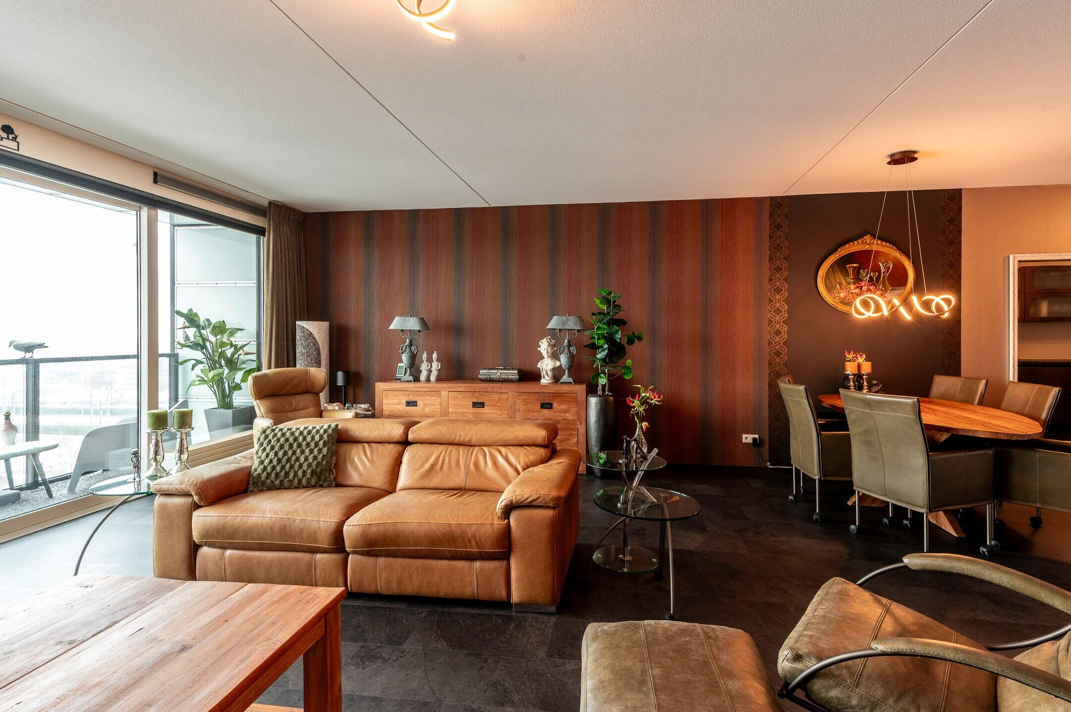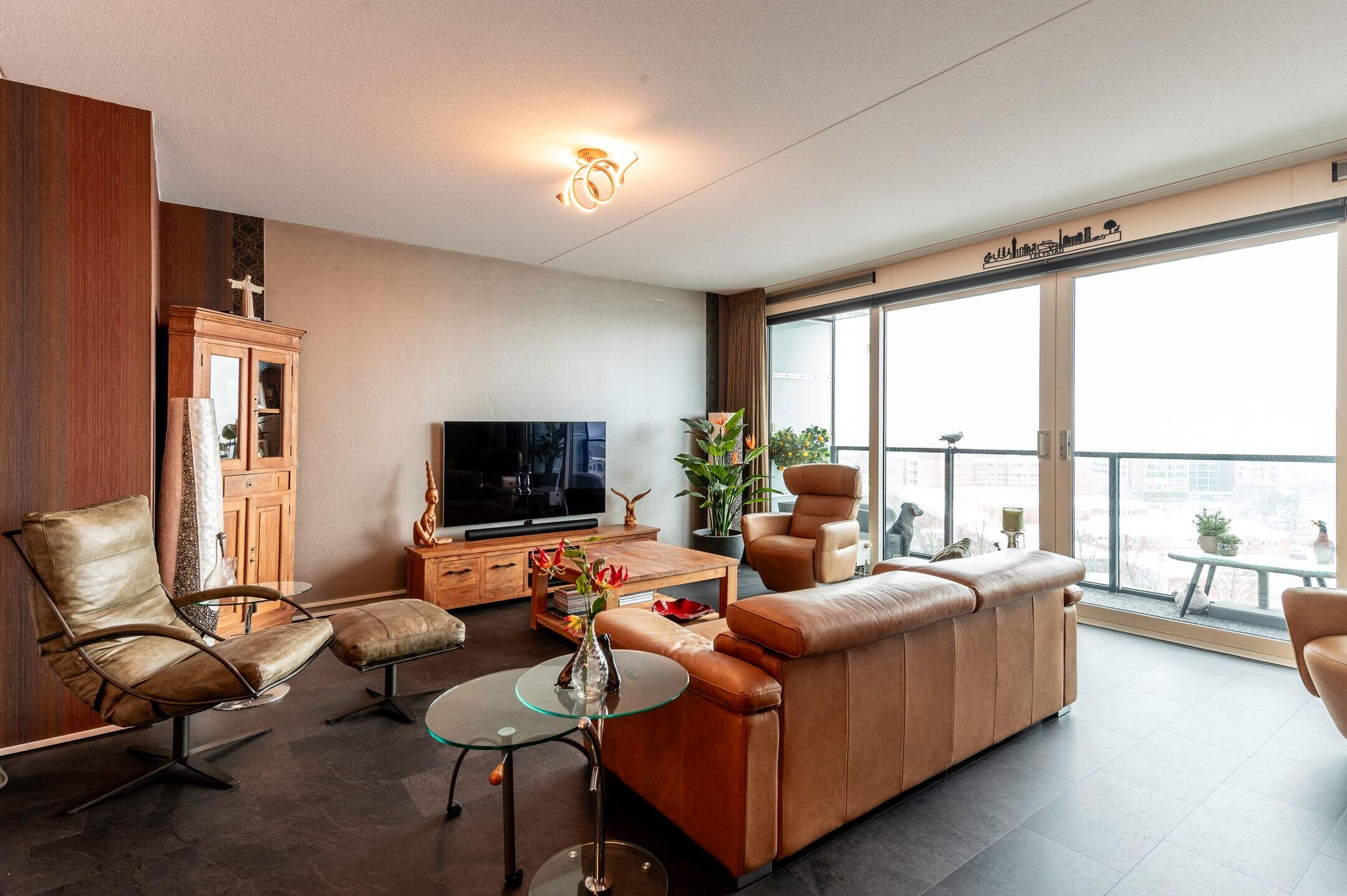 Achtste verdieping (appartement): Entree; hal met meterkast, toilet en toegang tot de woonkamer, twee slaapkamers en de badkamer; woonkamer van 44m² met twee schuifdeuren welke toegang bieden tot het een het balkon op het zuiden van 6 meter breed met uitzicht op een waterpartij; keuken uit 2024 in hoekopstelling en voorzien van onder meer een Quooker, oven, (wijn)klimaatkast, een Bora inductiekookplaat met interne afzuiging, vaatwasser en toegang tot de bijkeuken; bijkeuken met witgoedaansluitingen, de CV-opstelling en de mv-box (beide in 2021 vervangen) ; twee slaapkamers van respectievelijk 13,1- en 20,3m²; badkamer welke in 2021 is vervangen en is voorzien van volledige betegeling, een zgn. Japans toilet (toilet met bidetfunctie), een wastafelmeubel met 2 wastafels en 2 spiegels en een ruime inloopdouche met regendouche en een sunshower.